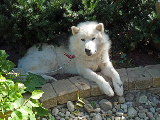 ![]() Toko (front) on the trail to Kimmirut photo: S.L. Han For the Love of a Retired Sled Dog by Kim Han Ottawa, Ontario, Canada I first met Toko when I visited my daughter, Siu-Ling, in Iqaluit, Nunavut, Canada. He was a little ball of soft, creamy white fur. When we took him for a walk on the tundra in Sylvia Grinnell Park, he trotted ahead of us, followed by his brother, Rode, darting here and there, sniffing left and right, happily exploring his surroundings. His curiosity knew no bounds and, at eight weeks, this little pup already showed leadership qualities. Toko was handled and socialized since the day he was born. He was lovingly raised by Siu-Ling who trained her dogs with lavish praise and affection, balanced with a firm hand and stern voice when necessary. They knew who was in command but they also wanted to please her. Toko learned to listen and cooperate, two essential qualities in a good sled dog. Almost nine years have passed since I first met Toko. In the intervening time he has pulled Siu-Ling into third place at the 2007 Qimualaniq Quest, and into second place in 2008. He was lead dog on Siu-Ling's team for a number of years before he became boss dog. The boss dog commands respect from his subordinates. He is the one who breaks up fights among the dogs in the team and disciplines the younger ones when they get out of line. In April, 2009, Siu-Ling and Matty McNair travelled north up the coast of Baffin Island with two other women, Debbie McAllister and Connie Maley, friends from Calgary, Alberta who spent months preparing for this once-in-a-lifetime thousand kilometer (620 mi) dog-sledding trip. Together, these four amazing women skied along the east coast of Baffin Island with Matty's team of fourteen and Siu-Ling's team of ten dogs, including Toko, pulling sleds loaded with equipment and supplies. Half-way through the trip, after stopping at Clyde River, Toko suddenly decided that he no longer wanted to be a sled dog. Although he had shown some signs of soreness during the trip, he always came eagerly to be harnessed. Siu-Ling usually lets her dogs loose and calls them to the sled when it was time to go. However, on this day, as the two teams were getting ready to continue their journey north, Toko did not come to the sled to be harnessed. Instead, as the last dogs were being harnessed, he was nowhere to be found. Then he was seen – in the distance, trotting towards town. He obviously did not want to join the team. That's when Siu-Ling decided to take Toko into Clyde River and put him on the next plane back to Iqaluit. She did not want to risk any problems with a reluctant sled dog who might not be well enough to travel the remaining half-way up the East Baffin coast to Pond Inlet, across one of the most isolated parts of the island. Siu-Ling decided to retire Toko, sending him to Ottawa in May, 2009 for a complete check-up, and to have him neutered. Other than the stiff neck and shoulders, the vet could not find anything wrong. He prescribed glucosamine for his joints and an anti-inflammatory to control Toko's occasional flare-ups. Siu-Ling's brother Jeff, who lives in a rural area outside Ottawa, decided to adopt Toko. There were two other dogs in the family, a mutt named Marley and Cleo, one of Toko's offspring that was adopted by Jeff when she was eight weeks old. In his new home, Toko had company and plenty of space to roam in. Although he was quite clumsy at the beginning, running and tripping over bushes, he quickly learned to adapt to his new surroundings, smells, sights and sounds. He was quite happy, in spite of the warm temperatures of an Ottawa summer that sometimes can reach 30°C (88°F) or more. Toko enjoying a more relaxed life in retirement photo: K. Han When Jeff and his family went on holiday, I offered to look after Toko at my house in Ottawa. That was June, 2009. I still have him because I could not help falling in love with this big sled dog. He is happy and content just sitting on my back patio, or on the deck above it. He climbs up and down the stairs to the deck off my kitchen, depending where I am, hoping that I will invite him in. Although it is very tempting to do so, especially, when he looks at me with those big brown, dewy eyes, Toko is an outdoor dog. He has lived outdoors in a harsh arctic environment all his life. An arctic dog does not belong in a house. We did, however, build him a cozy doghouse that is waterproof and has soft padding inside, but Toko still prefers to just sit on my deck, from where he can see me when I am in the kitchen. The first couple of weeks I had Toko I had to learn, yes, learn how to walk him on a leash. As a sled dog, Toko was not used to being walked on a leash but he was well-trained to listen to commands. He listens to simple commands like "whoa", "stop", "stay", "left", "right", "off" and "no!" When we go by a house on garbage day, he is tempted to sniff the garbage but a stern "on-by!" and a jerk on the leash keeps him under control. He'll walk by but not without looking back regretfully as if saying, "Aw! Too bad! Oh, well ..." This naturally deserves a lot of praise. He certainly knows what it means when you tell him he's a good boy. It shows in the way he immediately holds up his head high, and in the quickening of his gait which clearly demonstrates that he is proud of himself. Toko has adapted well to living in Ottawa but I make sure I take him for a good walk every day. I usually take him to the nearby nature trails or the Trans Canada Trail, minutes away from our house. I try to avoid other dogs as much as possible, especially, if they seem aggressive. You never know how a sled dog might react, especially because Inuit Dogs are known to love a good fight. They are very sensitive to aggressive or dominant behaviour in other dogs and react to it. There is no need to court an altercation with another dog. We have had many friendly 'sniff and wag' social moments with other dogs on the street, but