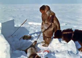 Although some of the action may have been performed for the camera, what you see is truly authentic and represents the last vestiges of a soon-to-disappear way of life. These scenes carry Tuktu and his Eskimo Dogs and that is important to keep in mind because the dialog lacks authenticity (apparently not created from any Inuktitut translation, or at least not a very good one) and is clearly non-Inuit in origin nor is the narrator or the way he speaks. The same can to be said for the lack of relevance of the musical accompaniment. In creating the Unikkausivut series, NFB was aware that many of their films were originally made by and bore the unmistakable characteristics of a non-indigenous culture. In a September 2011 The Fan Hitch interview, Assistant Commissioner of the National Film Board of Canada, Claude Joli-Coeur, explained, “That is a part of the richness of our collection, to see the evolution of how Inuit culture was represented. We have films that were originally made by white people, with a European approach. And later, we see white people who have transformed themselves through the cause of the Inuit, becoming almost Inuit themselves. We are now making films with Inuit creators. And we have selected the films to give you that historical perspective.” So it is important to wade past much of what is audibly described and focus on the visual evidence.