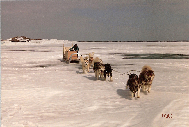 My daughter Lara driving a team of dogs on Great Slave Lake