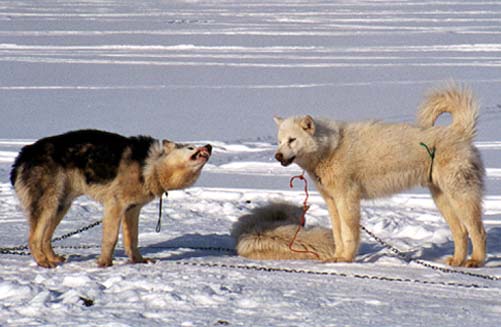 Food is put down in bowls, the dogs switch around. When they have finished, they lick each other's mouths, then the females lick the boss' penis. He stands still, a picture of contentment. Next they rub flanks and do another round of mouth licking. Often they take a slow run around the pen, flanks to flanks, finishing in the male rubbing his chin over the back - usually just behind the shoulders - of the nearest female. Pups/young dogs rub their mouths against the boss's, and follow with the neck and their whole body against the boss's chest, who stands patiently. Then he rubs his mouth lightly against the young ones' mouths, down his neck and rubs his chin over the back - usually just behind the shoulders - of the young ones. Boss (and any male below if he is alone, therefore the boss) lunges at a female so she rolls down squealing, he stands over her, growling with biting-like motions - but he doesn't actually bite. All the while she squeals blue murder. Then he walks away and she yaps behind him in a very outraged tone. Oh yes, they do have different tones. If he walks away immediately after throwing her down and does not go through the ritual of growling and biting, she runs towards him, slithering on the ground right into his legs, and squealing appropriately. He usually ignores such a display. Females who have an older pup with them, bond strongly with him/her and will defend him/her against the boss or another dog, by standing next to him/her and yapping with outrage when being submitted by the boss. Then she licks him/her, since he/she has urinated over him/herself. And all the dogs scent themselves on the trail by rolling in some mysterious substances. Sometimes it's bear scats, or wolf droppings, most times there is nothing to see - or to smell for us humans. |