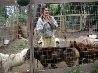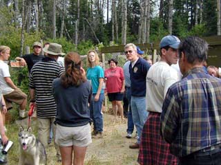Hamilton photo Inuit Sled Dog International Holds First Official Conference reported by Sue Hamilton The Inuit Sled Dog International (ISDI) held its first official meeting on the weekend of July 13 to 15 in Ely, Minnesota [USA]. Hosts Paul and Susan Schurke welcomed about forty ISD enthusiasts from across the United States and Southern Canada as well as locally from Ely, at their Wintergreen Dog Sledding Lodge. More of a family reunion than a meeting, the event, officially described as the "Gathering", seemed aptly titled. Folks who may have only previously communicated via email, snail mail or the occasional telephone call, and some who had never met each other assembled for what can be described as a sense that this was an opportunity to "seize the moment". Despite the moderate heat and humidity and some bloodthirsty mosquitoes, spirits were high and the atmosphere was full of enthusiasm and optimism. In between mouthfuls of food and the scheduled programs, veteran ISD owners and a few wide-eyed newcomers filled the air with a cacophony of conversation, sometimes long into the night, about their favorite subject: the Inuit Sled Dog. Folks from a full spectrum of working backgrounds (educators; fraud investigators; supervisors; truck drivers; a former professional hockey player; outfitters; sales reps and manufacturers; writers; dog food, pharmaceutical, veterinary, and human medical professionals, and even some retirees) discovered how much they had in common. Heard from several people with small recreational ISD teams were expressions of relief and delight that they no longer felt alone, having discovered others who enjoy their hobby at a modest but rewarding level. The weekend began Friday afternoon as the participants arrived. Many came bearing contributions for the Friday evening potluck supper. Also offered was a wide array of items donated for Saturday's Chinese auction. Room assignments and registration packets containing the program, participant list, embroidered patch bearing the new ISDI logo and a commemorative ID badge were handed out. After folks settled their gear into their sleeping quarters (some choosing to camp), they quickly got down to getting to know each other as they nibbled on munchies, while the lodge's twenty-four-foot table was covered from end to end with dinner items, and an outdoor cooker was fired up for the super fresh corn on the cob. A few calories were burned off as the assemblage ambled over to the "big house" as it was called, Paul and Susan's personal residence, where extra chairs borrowed from a local church were set up for the larger than anticipated crowd. After brief welcoming remarks, and a reading of the ISDI financial report, Ely resident Will Steger offered a retrospect of how he came to be an polar adventurer. The evening was rounded out by a video and talk by John Senter of Oregon [USA] and Sylvia Feder of Washington [USA] on the Oregon Dune Mushers' Mail Run. This annual non-competitive carting event takes place in March. Teams of three dogs and larger trace an historical mail route, traveling up and down dunes of impressive height and along and sometimes in the surf that pounds the beautiful Pacific Northwest coast. Yes, Inuit Dogs "do" sand, too!