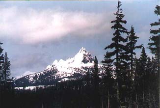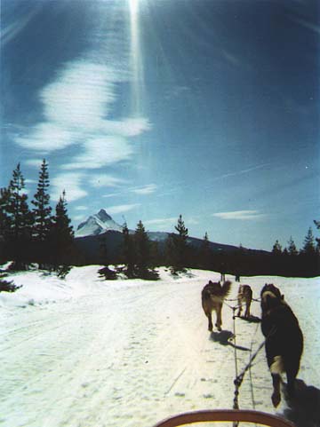 by John Senter Not everyone who fancies Inuit sled dogs lives in an area where actually using a dog sled regularly is possible. Here in Western Oregon, a snow storm is such a rarity that more than three inches of the stuff actually sticking is enough to cause school closures, non-stop emergency weather reports, installation of tire chains, and panic buying at the local food stores. So, while I own a dog sled, most of my mushing is on a cart. Actual dog sledding is something of an occasion for my wife Flo and me. It's a ninety-mile drive to our favorite place to sled, so we prepare for the trip the day before. The truck is fueled, equipment checked, clothing laid out. All we have to do is load the dogs, toss in a lunch and go. Our destination: Hoodoo Ski Bowl, at the summit of the Santiam Pass on U.S. Highway 20. As we drive, the forest shifts from the scrub oak and brush of the coastal range to the old growth douglas fir of the high Cascades. We pass familiar side roads where we have hunted or hiked. We drive through small communities that were once mill towns, sustained by the timber industry. What keeps them alive now is anybody's guess. The highway follows the Santiam River. This is a wild river, save for two hydroelectric dams near the little resort town of Detroit, about half way to Hoodoo. In the summer, the reservoir is full. Boats, jet skis, swimmers, campers, and fishermen are everywhere. In the winter, the reservoir is drained down, and you can see the actual river channel in some places with white water rapids, the stumps of the trees cut to accommodate the lake, and foundations of the buildings that were part of the old town of Detroit. I wonder what that old town and wild river must have been like before the dams were built. The mountains here are volcanic, so we have a few major peaks that stand out prominently above the foothills. Mt. Jefferson looms large over the highway on the drive up. Mt. Washington and Three Finger Jack await at the summit. It's clear today, so we should also see the Three Sisters while we're on the trail. After a two-hour drive, we arrive at our destination. Next to the parking lot there is a convenient place to tie off the sled. This winter the snow is twelve feet deep, so dragging the heavy freight sled up the slope to the trail is a chore. The dogs, now out of their boxes, are making a tremendous racket just to assure that I don't dawdle. Shadow is the self-appointed team cheerleader. He and our leader Smokey are in especially good voice today! Our other two dogs, Stormy and Bering, add their two cents to the din but it doesn't compare with the mindless bellowing of Smokey and Shadow. If I remember to bring them, I wear earplugs while harnessing, but I seem to have forgotten them today. Hook-up proceeds with Flo holding onto Smokey while I wrestle the other three dogs up the slope to the gangline. By the time Bering is hooked up at wheel, I'm a bit winded and looking forward taking off. I want to just stand on the runners and catch my breath. With the snub line taut, Flo gets into the sled. I step on and pull the quick-release. No need to say "hike" - we're off before I can get the word out! Suddenly it is very quiet. I hear only the rhythmic step of the dogs and the crunch of the snow under the runners. The craziness of the start soon gives way to a purposeful trot. Not fast, but not slow; just taking care of business. This is a busy place on weekends, but today is Wednesday and only a few snowmobiles are here. Right now, I can't hear any, so it's just Flo and me, four rowdy Inuit dogs, the sled and the scenery. Two cross country skiers are up ahead, oblivious to our approach. I call out "On by," to Smokey louder that I normally would so the unsuspecting skiers know we're coming. Smokey gets us by them, bless him, but Stormy would like to have investigated a little more. He probably smelled their lunches. Thankfully they don't have a loose dog with them.