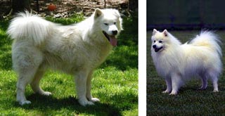 80# Canadian Inuit Dog 20# American Eskimo Dog Replica or the Real Deal by Sue Hamilton Some people don't mind owning a replica of, say, a 1963 Ferrari GTO. The rarity and the purchase price are reasons enough for being happy with a "look-alike" in the garage instead of one of the dozen or so hand assembled originals. I put quotation marks around "look-alike" because there are folks, like my husband Mark, for instance, who have the eye to recognize a fiberglass facsimile coming, going and side view. And even I think I can hear the difference between something that ought to have twenty-four humming valves and the high pitched whine of a dozen cylinders instead of the blat of eight. But those willing to endure the knowing glances of the well informed may also have decided that, aside from scarcity and financial investment, the time, effort and dollars applied to the upkeep of the real deal may be more than one would want to put up with. Even someone mechanically inclined may decide to seek more balance between life under the hood and well, anything else! Closer to home, Mark's "toy car" is a 1966 hybrid Triumph, GT-6 crossed with a rag topped Spitfire. For lack of time, it hasn't been out and about very much over the past two years and, being a proper British car with Lucas (the "Lords of Darkness") innards, it doesn't get used when it rains anyway. Mark decided to buy this particular car partly based on its mixed heritage - he was not duty bound to period and exacting restoration. Being relatively (and I use that term with some trepidation) cheap to purchase and restore, we both mostly enjoy ripping along country lanes courtesy of the GT's six cylinders and the airiness of the Spitfire's drop top. The moral obligation of perfect reproduction, as in all original parts, is a feature we need not fret over. Diff'rent strokes for diff'rent folks. And so it is with the owning of sled dogs. Some mushers are mostly concerned with speed, not pure breed. Some people like the looks (such as those of the Alaskan malamute) of a real freighting dog and fancy that they have a real freighting dog or, thankfully and mercifully, they have made the conscious decision to reject the hassles associated with owning an Inuit dog. There are many of us who fit the description of the dog that caught the bus and who now has to deal with the quarry. For any number of reasons and circumstances, issues surrounding Inuit Dog ownership may impact some more than others. It may be an especially tough transition for those of us whose northern breed experience is basically that of the Alaskan malamute, who lost patience with their performance while growing accustomed to their less intense behavior. I know it sure has been tough sledding for us. Hell, the first time we put our Pond Inlet Dogs in harness, it occurred to us that, aside from the fact that they'd never been hitched in tandem, which turned out not a problem, they didn't know any commands in English, which did! Furthermore, dogs used to receiving some of their commands and corrections delivered from the end of a seal skin whip were going to have to learn compliance in the "southern way", lest we be sent directly to jail by someone who, well, don't get me started down THAT trail! The practical application of the Law of Unintended Consequences. Having been mushing down the wrong trails with malamutes for twenty-five years and being the sort of people with a strong sense of history and the need to preserve heritage, we agreed we had no desire to "dumb down" the wickedly smart, eminently powerful, potentially explosive Inuit Sled Dog just to make them safe in situations we were so used to with our mals. If we truly desired the endurance, the general good health, the courage and heart and drive of an Inuit Sled Dog, we had to commit to the entire package - the noise, the occasional fighting, the high intensity to everything, that "exaggerated response to all stimuli" (to quote Bill Carpenter). We feel there is no middle ground. You're either in for the ride of your life, or do everyone a favor and stay out or get out. This may well mean a change from the dog-sledding lifestyle or other activities we were previously accustomed to. This revelation may come on suddenly sharp as if falling through the ice at minus twenty-five or more slowly, like the increasing throb of an ingrown toenail. However we become aware of them, these materializing changes serve as challenges, reminders, re-evaluations of our commitment to the breed. Whoops. It's the revenge of the learning curve! I'm not just pontificating here. A couple of Fan Hitch issues ago, I was poking fun of a friend for yelling at two of our males whom she thought were fighting when it was merely a reinforcement of their social order. A few months ago we took those two to the vet to be castrated, with the understanding that already matured to 5.5 and 2.5 years of age, hormone removal may be too late to help put an end to what became "hair, teeth and eyes all over the place". The boys are now living apart and we hope that they can reach the point where they are civil enough in each other's presence to work in harness on the same team. So, in the meantime, we now have no spare pens and are spending time on dog activities relating to re-acclimatizing the two warriors instead of doing the fun doggie stuff. Surely more Inuit Dog surprises await us in the coming years. We can only hope we will rise to those occasions. We must. Living with Inuit dogs need not be like always waiting for the other shoe to drop or always looking over your shoulder or cringing every time the phone rings. Yes, they are a huge responsibility, but as successful owners will tell you, the breed is well worth the extra effort. Yeah, they're different, but they're still sled dogs. And because the breed seems relatively new to the majority of the southern world of dog sledding, organizers of sled dog events must be educated about the breed as well. One woul