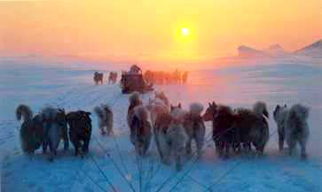 Teams in Greenland Ochovsky photo Dogs in Greenland by Lucien Ochovsky, Poprad, Slovak Republic Greenlanders harness twelve or more Greenland Inuit Sled Dogs (GISD) to a sled. The selection of non-aggressive dogs ensures the cooperation of such a large number on a team. Each team is also extensively socialized so that they can travel together, and should it become entangled with another team a fight won't necessarily break out. The Greenlanders will chose to mate a bitch with a submissive dog, not the boss dog, in the hope that the more gentle qualities will be passed on. The GISD has a strong pack and territory instinct. The hierarchy is fixed and fights are rare. The alpha dog and the alpha female keep order among the rest of the pack. Each dog knows its place in descending order. They pull in fan hitch and they are next to each other when they are fed. They wait for their turn. Socialization starts at birth. The adult dogs are picketed two by two on one stake. The chain is four meters (13 ft) long and is attached with two swivel devices. Only pairs of dogs that get along together, usually a dominant and a submissive one, are staked together. Physical contact with neighboring dogs is not possible as two to five meters (6 ft to 17 ft) separates them. Each pack is tethered twenty to fifty meters (62 ft to 155 ft) from another pack. During a trip, dogs are picketed two-by-two on a stakeout chain or in a fan hitch. The end points of the lines are buried under the ice. Bitches are provided with a wooden kennel. At first, puppies roam free. As they grow they are picketed. The bitch's male companion remains on the stake the whole time, including during the birthing. Never are two bitches picketed together. There are never more than two or three bitches in any one pack. As they grow, the puppies explore the pack and come into contact with the other dogs. The adults generally avoid or ignore the juvenile dogs. They don't hurt them. At about four months of age, the behavior of adult and young dogs begins to change. The juveniles start a process of integration into the pack. The adults begin to see challengers in the young dogs and try to subordinate them. The pups who do not submit are attacked, but can run out of the way since the adult is attached. Puppies are usually submissive but some are not. If they get caught by an adult they could be killed. Usually, pups respect the adults. The pups know their territory and the members of their pack, which they distinguish them from other packs. Infringement on another pack's territory leads to a fight. Some pups get killed by the members of their own pack and sometimes by other packs. Only the healthy and submissive pups survive to take their place in the team. The GISD is not aggressive toward other dogs and never toward people. If a dog becomes aggressive, he is euthanized. Usually, only one or two pups make it to adulthood. They die of disease, freeze or are killed by adults. This is natural selection at work. The well-socialized adults accept submissive dogs from another pack. The young dogs are exchanged with others packs. Dogs of the same sex and same litter may cause trouble. The Canadian Inuit say they are "of one mind". The juvenile dogs run free alongside the sled. From time to time, they join the dogs in harness and imitate the pulling motion. At the age of ten months, they are put in harness on the outside of the fan hitch. At this age, they are not able to pull for the whole journey and are allowed to run with a loose rope. They are prevented from getting behind the sled - a piece of wood is tied to the middle of all the lines so that if the pups were to go toward the back of the sled they cannot reach it. Weak dogs sometimes lie down, resigned, and are dragged by the rest of the team. Some hunters take the dog to the sled and strike his nose with the whip handle. Others simply allow the dog to rest on the sled, or to run free next to the sled for the last few kilometers. After the first journey, the juvenile is staked out by himself for sometime before being picketed with an adult. If an adult dog is introduced to a team, he has very little chance of survival. The pack rarely accepts a newcomer. Such is a dog's life in Greenland.