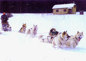 Building My Greenland Inuit Dog Team by Lucian Okovsky When I started building my team, I learned that the pack instinct is an innate characteristic of the Inuit Sled Dog. The pack has a hierarchical organization which is developed over a period of time through a process of socialization. A pack containing several generations is ideal. A musher will start with an unrelated pair of adults and breed them. Parents and a selection of offspring - as few breeders keep the whole litter - will constitute the base of the pack. When I started my pack I chose a mature bitch and a mature male from different packs. I chose submissive dogs, not dominant ones. I kept three pups: a female and two males. This family has the run of a pen approximately fifty meters by thirty. But for the first four weeks after she delivered, the bitch was alone in a pen with her pups. Then I let the male in. He was interested in the pups and was good to them. All the same, the bitch was very protective, keeping him away. By four months, the individual characters of the young dogs begin to show. Even earlier than that, it is possible to determine whether a dog will be submissive or dominant. From the moment they can stand, the pups play. These tussles mimic fighting. When they mature sexually, after six months, the play fighting continues but occasionally a fight for dominance occurs. If there are two or three young dogs in the pack, they will fight seriously for a few months until they have determined their hierarchy. The adult male is the boss and will usually intervene and break up the fight. At feeding time, I picket the adults. When they have finished, I let all the dogs socialize. What I like to do is rotate the young dogs between my two packs, so that all the dogs are socialized. I found that there was no problem when I mixed a mature dog with a young dog, a mature bitch with her daughter or son or both, a dominant with a submissive dog, a male and a female of about the same age. I had less success when combining brothers, sisters, a female with a female from a different pack or two dominant dogs. Also, I found very difficult to integrate mature dogs brought in from other kennels. In order to introduce new blood into the kennel, a musher sometimes needs to acquire a pup from a different breeder. The best age is between the age of ten and twelve weeks. A dog is submissive to the dogs stronger than him, but will become dominant to a younger dog. All the dogs in the pack are vying to get a higher position. When the boss dog does his job, the other dogs settle in their places. By the time the pups are ten months, I hitch up a team of