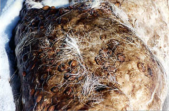 On our way back to Pond Inlet we take a break while Jayko untangles the tug lines. Tom's snow machine in background Hamilton photo How We Met Tom by Sue Hamilton We met Tom one April, about four days out of Pond Inlet. Jayko, Mark and I and twenty dogs were camped on the ice near the floe edge on Lancaster Sound in between the top of Baffin and Bylot Islands, next to a tiny, steep-sided island smaller than the dimensions of a soccer field. Travel out to camp was difficult and the dogs had worked extra long and hard. Unfortunately, there was nothing to hunt on the way. There was no way to hunt at the floe edge either. Access to that interface of ice and water was blocked by huge slabs of thick ice thrust on end by wind and tide, jutting twenty or more feet into the air, preventing safe passage to where a walrus might be shot and hauled in for us and the dogs to eat. Other ice pans, broken loose from their cousins, went grinding by in the current. Returning from a failed attempt to reach the floe edge, the dogs scrambled over a four-foot pressure ridge and lunged forward across the flat section on the far side, thrusting the front of the qamutiq skyward and flinging me off backwards onto a jagged chunk of ice. After zigzagging our way back to camp through this obstacle course, me groaning with every bump, we picketed the dogs, had our dinner and commenced waiting. Our provisions included some caribou for both the dogs and us. The hunk of meat was wrapped in the animal's own hide, the underside of which was covered with the larvae of fly warbles. In the fall, the momma fly deposits her eggs under the skin on the back of the caribou where they incubate, warm and snug, through the long cold winter, creating open sores as they erupt through the animal's hide the following spring. I was told these fat grub-looking things are considered delicacies.