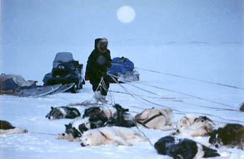 The previous day, over the Spilsbury (short-wave radio), Jayko had requested support in the way of dog food from his friend Tom, who was expected to arrive from Pond Inlet that same evening. It normally takes about three hours by snow machine to span the 120 miles from the hamlet to our camp. Due to bad weather and equipment problems, Tom didn't come. And so the dogs went without food after another day of very hard work. On the evening of this, the fourth day, Tom was once again expected. It was now 11:00 p.m. and still no Tom. All we knew was that he had indeed left Pond, five hours ago. If Jayko was worried, he didn't show it. I was concerned for the welfare of this person I did not know and because I was wondering when the hungry dogs were going to be next fed. On this relatively mild and windless night I stood alone in the dusky light created by clouds covering the spring sun, about a hundred yards from the tent, wearing only my bib pants and expedition weight underwear top. Not bothering to take a "bear dog" as Jayko would have preferred, I was more worried about falling into cracks in the sea ice covered by blown snow lurking somewhere, everywhere beneath my feet, than the return of the two polar bears we chased away from the area when we set up camp. I looked to the southeast up Navy Board Sound, straining my eyes for a glimpse of a headlight. I cocked my ear in that direction, hoping to hear the sound of an engine piercing the quintessential silence of this arctic night. What I heard were footsteps coming from behind, squeaking on the thin cover of dry snow. It was Mark urging me to return to the tent. I was almost asleep on my feet, apprehensive about the pain I was going to experience settling into the sleeping bag. My injured back was already the color of raw seal meat - dark and purple-brown - and I doubted that aspirin would offer relief. I wanted to be awake to greet this visitor, who was bringing food for our dogs so we could eventually get back to Pond. At Mark's insistence I returned to the tent and after a few minutes of wincing into place, managed to fall into a blessed sleep. It seemed as if I had been asleep for only minutes when there was a deafening roar next to my head. A snow machine, towing a heavily laden eighteen-foot qamutiq sputtered to a rest outside the tent. The three of us scrambled into our boots and parkas and rushed outside. An exhausted driver staggered off his snow machine. We all set to work hurriedly unpacking the qamutiq to get to the food for the now screaming dogs. Not having had time for "formal" introductions by Jayko, an unmitted hand was thrust in my direction, "By the way, my name is Tom. Nice to meet you." And then we all returned to the task at hand. After much unpacking, a large cardboard box was produced. To my surprise, instead of seal, the only food for the dogs Tom was able to bring with him was frozen fish. The Arctic char were quite large so they were hacked up with an ax, portioned out and, as there was not even enough fish to adequately feed the dogs, their meal was supplemented with much of the caribou meant for us. If necessary, Mark and I would be relegated to eating "southern food", while Jayko was perfectly satisfied to eat the fish he packed for himself. The dogs settled down to gnawing on their frozen meal. Tom brought his gear into the tent and while I set up his bedroll complete with the pillow, he brought along, he hungrily bolted down leftovers from our caribou stew dinner. He had driven in a blinding snowstorm, over rough ice and hidden cracks, in gale force winds, often loosing the trail - an eight-hour trip that should have taken three. Somewhere around 4:00 a.m. we retreated into our sleeping bags and within minutes became unconscious, even Jayko. He decided it wasn't worth remaining fully dressed and awake again, clutching his loaded rifle, just in case nanuq returned to the neighborhood. On this occasion, he assigned guard duty to the dogs. |