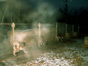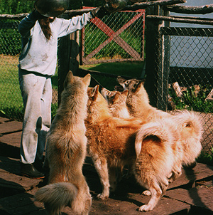 However, at a time when we had rescued dogs and didn't have enough large pens, I noticed a higher incidence of fighting - dirty fighting too, with puncture wounds and slashed faces being the most frequent. There comes a time when the boss no longer has the same speed and strength. That's when he is challenged by a younger male. When he loses, and depending on the individual, he accepts defeat remaining in the pack but not taking part in its general life. A defeated boss dog doesn't live long when he remains in his pack. I prefer to take him and the oldest female to live in comfort in a smaller pen. Currently we have four old couples, eleven to thirteen years. There is one more observation I have to report. If you don't like being grossed out, stop reading now. Pups eat warm feces. Like they did in ancestral arctic times, they run up to the defecating adult and catch the matter before it hits the ground. They have their favorite too, their parents' feces being the most sought after. They continue vying for this delicacy into adulthood, sometimes until four or five years of age. Right from puppyhood, dogs are keen observers of the adult behavior and copy it. This lead me to remove a male with a detestable attitude from the pack so that the pups wouldn't copy him. He now lives with his grandmother, and with much individual attention, has abandoned his obnoxious behavior. But he won't return to the pack. Once a dog has been removed for a length of time, it is almost impossible to re-integrate him. The harmony has been destroyed. That's life in a pack. |