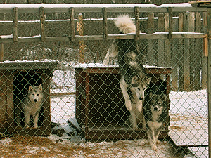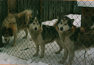 Life in the Pack by Geneviève Montcombroux When we moved to the Interlake region of Manitoba with the intention to breed our Inuit Sled Dogs, the idea was to recreate as much as possible their native environment. We felt that the seven-month long winter would compensate for the heat of summer. In the past, when Inuit were nomadic, their dogs used to roam free in the camps. We couldn't have them run free so the next best thing was large pens. The pens are close to the house and I can see each of them from the windows, an excellent observation post. Since we couldn't get seal to feed the dogs, I consulted the Winnipeg Zoo nutritionist, and we came up with a meat-based diet which includes muscle and organ meat, fat, rice - the ISD like the wild canidae does not assimilate most other grains - and a zinc, vitamin B complex, salt and calcium supplement. Our adult dogs reach the optimum sizes: 40-41kg(88-90lbs) for males, 26-27kg(58-60lbs) for females. Our old dogs (11 to 14) have clear eyes, hear perfectly well - when they want to - and in winter still run 3 km (2 miles) albeit slower than they used to. There has been no sign of arthritis except in a couple of dogs that had sustained a significant joint injury. Over the years the size of our packs have fluctuated. A small pack is made up of four dogs, a big pack is seven to nine dogs with a range of ages. Six-week-old puppies meet the adult dogs of their pack on a one-to-one basis. By ten or twelve weeks, they join the pack. Puppies are definitely at the bottom rung of the ladder. They have learned to squeal playing with each other under their mother's tolerant supervision. Now in the pack, their squealing takes new proportions. The squealing must have an effect on the adult males. I have never seen one hurting a squealing pup. My first observation of this was when I took the boss dog of their future pack, in harness, out walking with the pups and their mother. If there is another female in that pack, usually the grandmother, she too comes along for the first walk. I don't normally keep more than two females per pack, and they are always related females. Packs that are composed of family members are more cohesive than those made up with unrelated dogs.