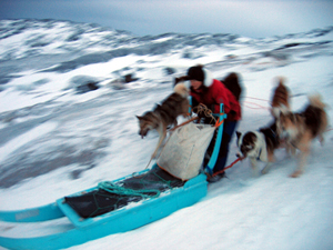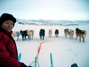 After some weeks in Ilulissat I got my own dog team, ten big, strong and healthy Greenlandic dogs. Only one of them was a female. Her name is Tuttu, which means reindeer in Greenlandic. The dogs weigh from 28 to 43 kg. I was lucky to be able to buy a whole dog team so I didn't have to struggle to put together dogs from different families. That is often a major job. I started to mush with them and there were no problems at all. But it was the first time I mushed with the fan hitch! And that was totally different from what I knew from back in Norway. It was strange to sit on the sled and not to have a brake to count on. On my very first trip alone with the dogs I had four of them in lead. It was glorious! Now I prefer to mush with six to eight dogs, but on weekend trips I bring nine or ten along. My kennel has grown to fourteen dogs. Now the biggest is 45 kg. Baloo hadn't been in front of a sled before, and he had to learn to be part of a dog team. That was a tricky case as he was the biggest and strongest dog of all but only wanted to mush when he got to have his mother with him. A lot of my spare time I spend with the dogs to get to know them. In that way I can have a greater control when I go mushing. I can jump off the sled and run ahead out on the trail and make them follow me everywhere. That is great fun. In Greenland mushers fall off their sleds pretty often, and then the dog team pretty often or almost always takes off back home and does not stop to pick up the unlucky musher. Because I practice having my dogs follow me, I won't have to walk home if I fall off the sled. I also do some skijoring, which is also great fun. For the most two dogs come to pull me around on my skiis.
