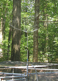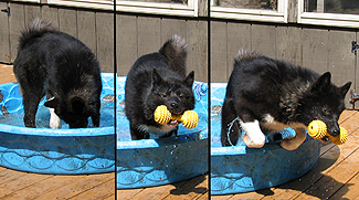 Photo: Hamilton Taking the Heat Off offered by Mark Hamilton A baking sun and hot weather is a health risk for sled dogs. During this weather, we provide lots of fresh, cool water. We ensure that 50% of each kennel run's surface is shaded. The quantity of food is reduced. Active exercise periods are restricted to the cooler parts of the day, in the early morning and evening. And we monitor the dogs for signs of distress. Another weapon we use to combat the hot days of summer is a rotary lawn sprinkler. The sprinkler we use has the rotary head mounted on a post around 90 cm. (3ft.) long. We mounted the sprinkler into the top of one of the fence posts in a central location of the kennel. A garden hose quick disconnect takes care of easily attaching the kennel hose when the sprinkler is needed. On a hot day, when the sun has baked the ground's surface and it feels like you're in an oven, running the sprinkler for about twenty minutes immediately cools the air temperature, kennel surface, dog houses, resting platforms and any dogs that choose to stay out in the little artificial rain storm. Once all those surfaces are wet down, the evaporative cooling significantly extends the now improved conditions beyond the time when the sprinkler is shut off.