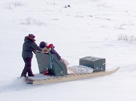 After five days on the trail, we arrived in the village of Tasiujaq, which sits in a very picturesque area on Ungava Bay and is home of the highest measured tide in North America, sixteen meters (fifty-two feet). We all enjoyed hot showers, walking the streets of this small community and meeting local people. The next morning we flew back to Kuujjuaq for our last night's stay. It was so great to see from the air the country we had just traveled through and once again feel its vastness. Another added attraction of our tour was visiting some interesting sites in Kuujjuaq. There is a very successful fish hatchery, started by Allen, which raises arctic char from eggs to small fish and releases them into local lakes. Some other interesting stops were the village's large walk-in freezer, where people bring meat and fish from the land for anyone's consumption, the hunter's and trapper's association selling furs and locally made clothing, gift shops with crafts and souvenirs, the Nunavik government offices and of course the local color at the only restaurant in town. With the influx of people from the south, no doubt a lot of changes are taking place in the North and the town of Kuujjuaq. But the countryside hasn't changed, and Allen's traditional breed of dog hasn't changed either. I find going out on the land with the Inuit such a rich experience. The stories of days gone by are rich with the steadfastness and stamina of these people surviving in some of the most inhospitable country in the world. Nunavik is a great place to visit and to feel a connection with the land and a culture for which I have utmost respect.