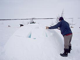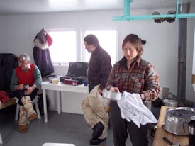Our other guide, Willy, was a quiet man with a lot of good skills on the land, such as making a perfect igloo during an idle stay at an overnight cabin. He was also good at spotting muskox, tracks of wolves and arctic foxes and assisting with handling the dogs. Our layover day was at the comfortable Wolf Lake camp. We did some ice fishing for arctic char in nearby lakes. It was a beautiful day and very peaceful as we sat bobbing our lines through one-and-a-half meters (five feet) of ice waiting for the big bite. Allen and Willy went ptarmigan hunting and provided us with a feast of fresh meat for dinner!