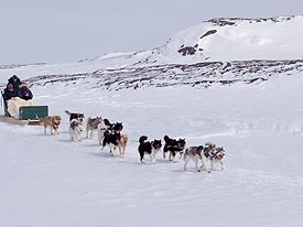 Spring of 2006 was our first guided adventure with Allen and we had two very seasoned travelers from Scotland with us. Allan and Evelyn McNichol, seventy-nine and eighty years-old, have traveled the world and for the past sixteen years have been on many northern dog sledding trips with us. We told Allen that Allan and Evelyn would need a comfortable sled to travel on and did he ever provide a beautiful new qamutiq for them! I nicknamed it "The Chariot". Allan and Evelyn were very well looked after and had a cozy perch, sitting up high enabled them to comfortably enjoy the views of the beautiful countryside we traveled through. While Allen traveled ahead by snowmobile, I drove the team standing behind Allan and Evelyn on a platform. This qamutiq was equipped with a claw brake for down hills and a snowhook as an emergency brake. After running my Yukon Huskies for twenty-seven years, I was impressed with the strength of the Inuit Dogs. The stamina they showed traveling from Kuujjuaq to Tasiujaq, averaging forty kilometers (twenty-five miles) a day through a lot of unbroken trail with a heavy load, was remarkable. Inuit Dogs are the draft horses of the sled dog world. Our fourteen-dog team was also very well behaved. Allen has socialized them well, which makes them enjoyable to travel with. Our young eight-month-old lead dog was also a very good hunter. As we mushed along, he spotted a gyrfalcon sitting on the mountainside, as well as a big herd of muskox which we were able to get quite close to. I really enjoyed running the team and getting to know all the dogs and their personalities. After a couple days they got to know me and my commands, even though I don't speak Inuktitut.