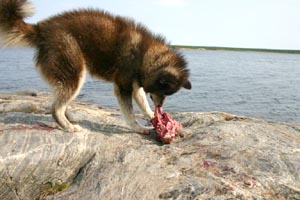 Reply: I would say your first step would be to ask yourself the following questions: 1) Why you want an Inuit Sled Dog as your one and only dog and 2) Is your situation is truly right for one (remember the ISD is not a pet or a "city" dog). Your next step would be to learn absolutely everything you could about the breed, starting with reading The Canadian Inuit Dog, Canada's Heritage by Genevieve Montcombroux and The Inuit Dog: Its Provenance, Environment and History by Ken MacRury. If you can, get to meet some ISDs in person. Then ask yourself if you have the dogged determination and will power to deal with this often difficult primitive breed. Sue September 11, 2006 Hello, I just happened across the on-line version of the The Fan Hitch, Volume 3, Number 3, June 2001 in which appeared an article "Inuit Dogs in New Hampshire, Part II". I am the son of the Labrador man, Jimmy Martin of Cartwright, whom Mr. Clark hired to bring the dogs from Labrador to New Hampshire, and your article has filled in a couple of holes in the story as we know it. It is particularly timely that I should come across this article now since I am in the process of organizing my memoirs. I visited the Clark Trading Post and Museum in Lincoln [New Hampshire, USA] in 1977 and saw my father's trail gear and paraphernalia on display there. The sled dog pretty well disappeared from the scene in Labrador with the arrival of the snow-mobile in the 1950s. There was a bit of a revival in the '70s but the breed has been sadly diluted and diminished. They hold traditional dog-team races there every year as part of their winter festivals, but the dogs are anything but pure anymore. Thank you for publishing this article and putting it on line. The story is an important part of our family legend. I also liked the bit about Clarence Birdseye. Father was his dog team driver as well. Sincerely, Michael Martin