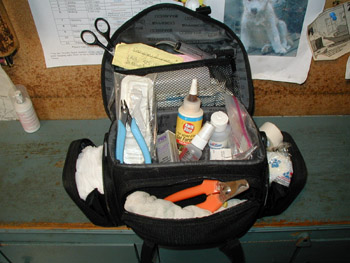 This well-stocked first aid kit measures: 13in. (33cm) l. x 8in. (20cm) w. x 8in. (20cm) h. photo: Hamilton It's in the Bag by Mark Hamilton Sue and I have multiple dog first aid kits. Our preference is to have one on each sled when we're running. We have one in our house in addition to our well-stocked first aid cabinet in the "dog pantry". Having an easily portable first aid kit in the house allows us to quickly take supplies out to a dog in the kennel rather than having to bring the dog into the house. Our first aid kits are not commercially pre-assembled products. We make them up ourselves, so they contain exactly the things we want to have immediately available. One of the hardest things about putting together a first aid kit is getting something suitable to serve as a case. We've found that a medium sized camera bag works well for us. These soft-sided and multi-pocketed bags are made so that the main compartment can be divided into sections. They have a number of additional smaller zippered pouches around the outside of the main compartment. They're padded, have convenient carry handles, are water resistant and often made of durable cordura nylon. These days they often show up reasonably priced at close-out stores.