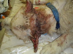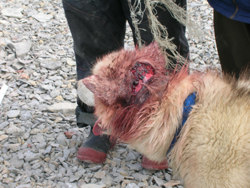 wounds from which they can heal. within the muscle layer. Photo courtesy of CAAT D.L.: But they're a little wimpy, though. They're like the husky breeds. No breed is worse than huskies for being wimpy. Just giving these Inuit Dogs injections, their vaccines, they all screamed! We never saw that in the other breeds at all. T.F.H.: What kind of help did you find that the owners and their dogs needed the most? D.L.: Mainly just the vaccinations. There was a By-Laws Officer there up until last fall and then he moved. He was giving all the dogs rabies vaccines. The government provides those because of the public health risk. The distemper-parvo vaccine, they didn't have that at all. So we'd go out with the team owners. The owners would introduce us to their dogs and hold them while we got them all vaccinated and wormed them. I think that vaccinating could be done by someone in the community. Veterinarians don't have to do it, as long as the dog is not obviously sick. Of the twenty-six communities, if there could be one or two main contact people, that's what we'd like to get going. Vaccines could be sent to them on a yearly basis. And they could make sure that all the dogs were vaccinated. T.F.H.: Did you find any non-indigenous, non-working, pet dogs while in Igluliq? D.L.: Yes. I'd say about half and half perhaps. A lot of Inuit Dogs were not actually in a team but were tied up outside the homes. There were a lot of smaller dogs like beagles, corgi crosses, a German Shepherd or two. T.F.H.: Those are the ones that need to be neutered. There's so much contamination of what few pure dogs are left. D.L.: Oh, for sure.