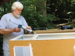 Materials and SuppliesFor most do-it-yourselfers, dog boxes are built of wood. They're either mostly wood or all wood. Typically we turn to plywood for making the large panels or all the panels. There are options in the plywood we select. Plywood is identified with an alphabetical code. The first two letters, A-D, grade the facing and back side surfaces of plywood. A is a relatively blemish free and well sanded surface, while D generally has the maximum allowed number of blemishes and a rough, unsanded surface. There are also different types of glues used in making plywood. We need exterior glue, so look for an X after the two letters identifying surface quality. Marine plywood is identified as AA. It is rather expensive. MDO (medium density overlay) has a reputation for being manufactured almost as carefully as marine plywood. MDO is also referred to as signboard and it has a sheet of kraft paper as the final lamination on one or both sides. MDO is already weatherproof as it is delivered and it costs less than marine plywood, yet a lot more expensive than "naked" plywood. If you are looking for pre-finished plywood there is a ¾" version that comes with white Filon® laminated on one side which is used in the truck box building industry. It's also made in oversize pieces, which frees you from the design restrictions of the 4'x8' dimensions of the typical sheet of plywood. You could probably buy as much as you needed at a shop that specializes in repairing commercial truck bodies. The downsides to this product are that it is heavy (to estimate the weight of a 4'x8' sheet of softwood plywood, figure on 11 lb. per 1/8" of thickness) and it is expensive. You need framing material for the construction of a dog box. It's not enough to just butt joint plywood and screw through one panel and into the end grain of the other. Spruce is strong as soft woods go. You can purchase kiln dried 2"x4" or 2"x6" spruce and rip it down into 1"x2"s on a table saw. Gluing up every joint is a good way to add durability to a dog box, as long as the glue holds. It's important to use glue that is actually waterproof, not just water-resistant. Check out the construction adhesives. I'm using PL400, but there are many products you can choose from.